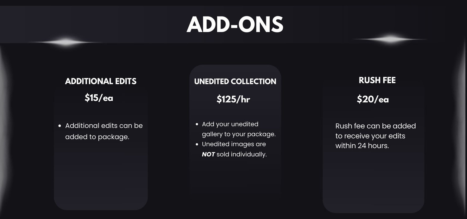 - Retainer is due at time of booking and balance is due in full before or at the time of session.